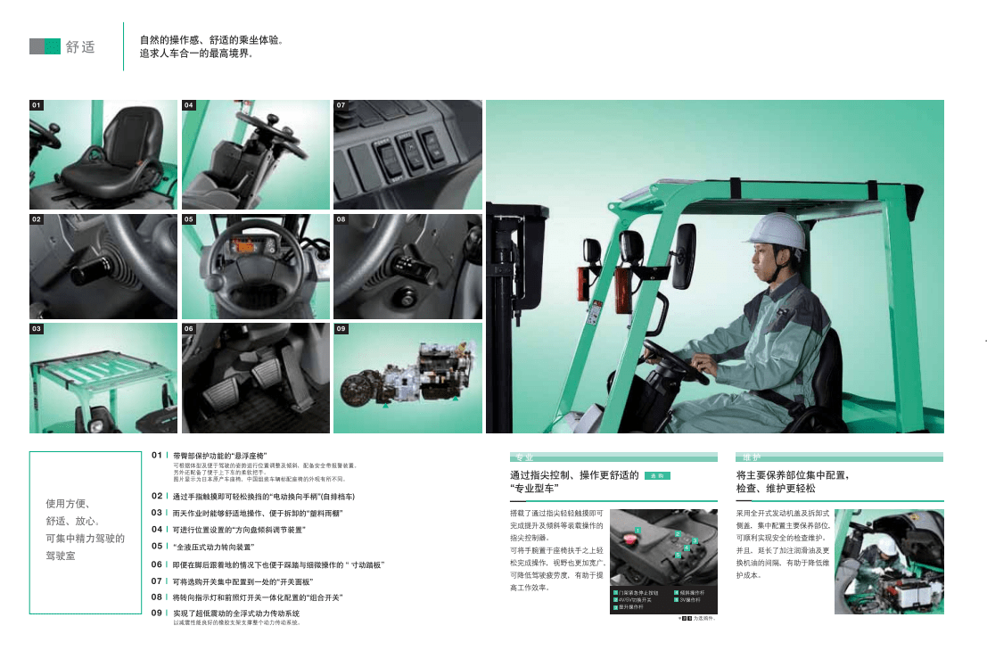 帶臂部保護功能的“懸浮座椅”通過手指觸摸即可輕松換擋的“電動換向手柄”雨天作業(yè)時能夠舒適地操作、便于拆卸的“塑料雨棚”可進行位置設(shè)置的"方向盤傾斜調(diào)節(jié)裝置"“全液壓式動力轉(zhuǎn)向裝置”即便在腳后跟著地的情況下也便于踩踏與潤微操作的“寸動...