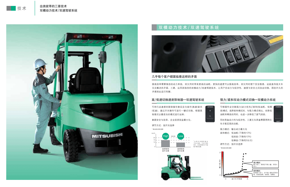 雙模動力技術/雙速駕駛系統提高效率需要強勁的動力系統,卻又同時帶來更高的油耗。更快的速度可以提高效率、卻又同時埋下安全隱患。這就是傳續叉車無法解決的矛盾。三遂,運用其獨創的雙模動力/雙速駕駛技術,讓用戶在動力與經濟性。建度與安全之間自由切換。...